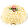 Chokladpenslad hasselnötmarängsbotten varvas med lager av maräng och chokladsockerkaka fyllda med grädde. Dekorerad med ark av choklad pudrad kakao och en hadgjord marsipanros.